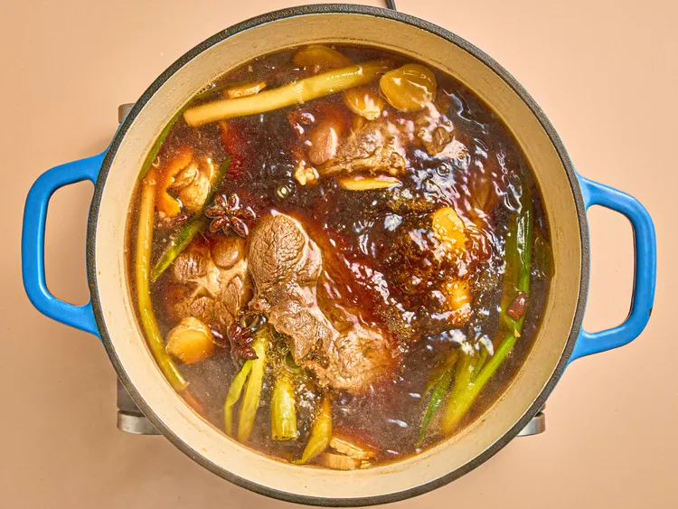 5、盖上锅盖,煮沸后调至中低火,不时翻动牛肉,炖煮 2 至 3 小时,至牛肉能用刀轻松刺穿。用钳子将牛腿放入大容器,加入适量炖汁浸没牛肉,剩余炖汁留在锅中,待牛腿冷却至室温,盖上盖子冷藏。