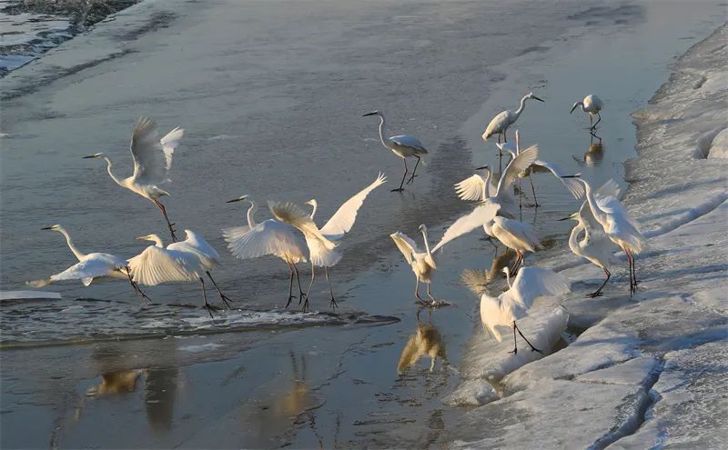 点评:拍摄群鸟时,对鸟的状态处理是关键。这张照片中的白鹭姿态各异,并呈现一定的飞动趋向,金色阳光带来的侧光照明让白鹭展现出立体形态,其轻盈的身姿如同一个个跳动的音符一般,充满律动之感。