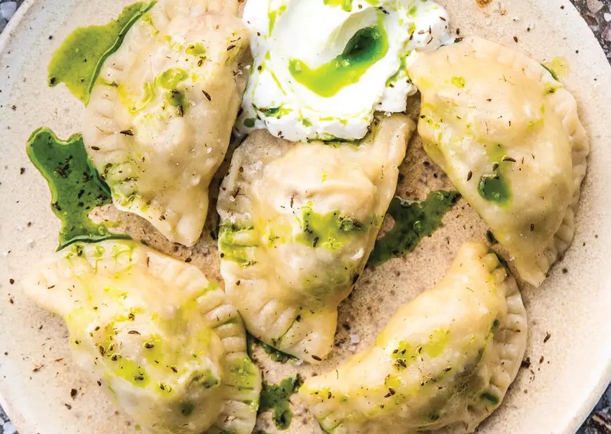 把煮好的饺子分装到四个盘子里,舀上一勺酸奶油,淋上之前做好的莳萝油,最后撒上少许葛缕子籽点缀。这道融合了传统与创新的波兰饺子就大功告成啦!一口咬下去,软糯的饺子皮、鲜香的馅料,搭配上独特的莳萝油,每一口都是满满的惊喜!