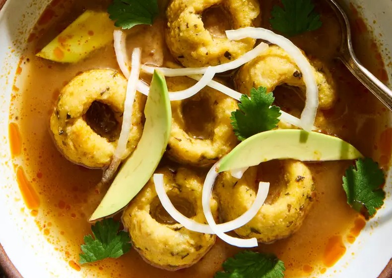 8、把煮好的鱼汤再次煮开,小心地放入玉米团子,不要放得太挤。煮到玉米团子都浮到汤面上,大概需要 15 分钟。最后再根据口味调整一下咸淡,把汤和玉米团子分装到碗里,撒上香菜叶、牛油果片和洋葱丝,就可以开吃啦!