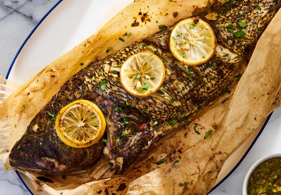 烤鱼:2 条鲈鱼或加吉鱼、适量食盐、黑胡椒粉、2 片柠檬、2 片月桂叶,轻轻碾碎