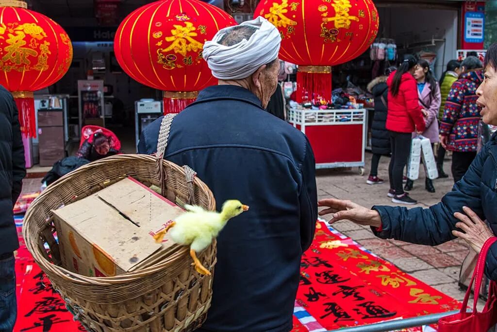点评:出现在集市上的趣味一幕被作者准确捕捉——小鸭子“越狱”的惊险瞬间与人物的自然情态结合得趣味盎然,充满反差,带给观者较强的现场感受,而“红色”元素则衬托出了年味氛围。