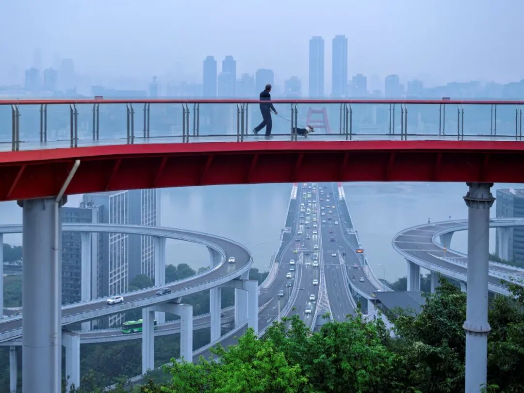 点评:作者通过角度的选取,精彩处理了现场的空间结构关系,不同桥体、公路的切割,以及色彩的运用,使得画面既具有鲜明的形式,又富有可观的细节,尤其是遛狗市民的恰当构置,起到点睛之效。
