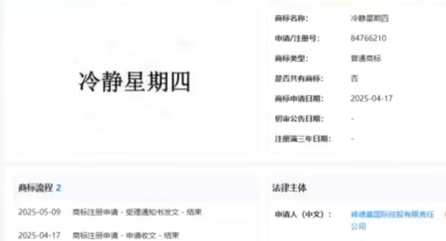 说起 “疯狂星期四”,那可是肯德基的 “王炸” 营销。从 2018 年开始,每周四肯德基都会搞特价活动,炸鸡、汉堡价格超划算。再加上网友们脑洞大开,创作出各种搞笑的 “疯四文学”,比如用悬疑故事开头,最后突然来一句 “V 我 50”(意思是转账 50 元一起吃肯德基),这些段子在朋友圈、短视频平台疯狂传播,直接把 “疯狂星期四” 变成了全民热梗。不过,肯德基虽然在餐饮类注册了 “疯狂星期四” 商标,但在其他领域,像方便食品、广告这些,被别人抢先注册了。这次申请 “冷静星期四”,不少人猜测,肯德基一是为了防止别人蹭 “疯狂星期四” 的热度,保护自家品牌;二是想为以后推出新活动提前做准备。