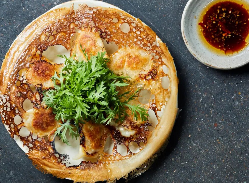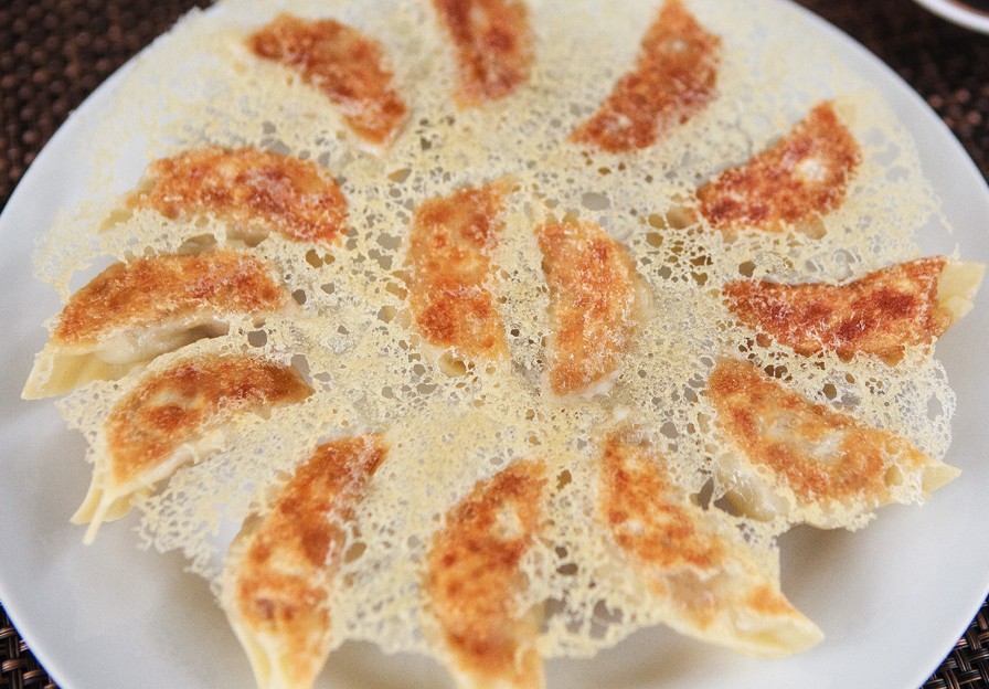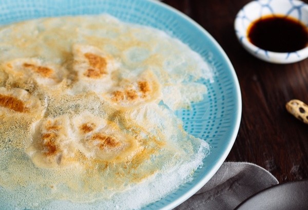 5、煎饺子:在煎锅中倒入食用油大火烧热,将 12 个饺子整齐摆成圆形。接着将玉米淀粉、面粉与 1 杯水充分搅拌均匀倒入锅中,迅速盖上锅盖煮 10 分钟左右,直至大部分水分蒸发。接着转小火揭开锅盖,继续煎 2 分钟让水分完全蒸干。用铲子小心地将饺子和煎出的脆底铲起,倒扣在盘子里,让金黄酥脆的一面朝上,看着就令人食欲大增!剩余饺子按照同样步骤煎制,每煎一锅都需重新调配玉米淀粉面粉水。