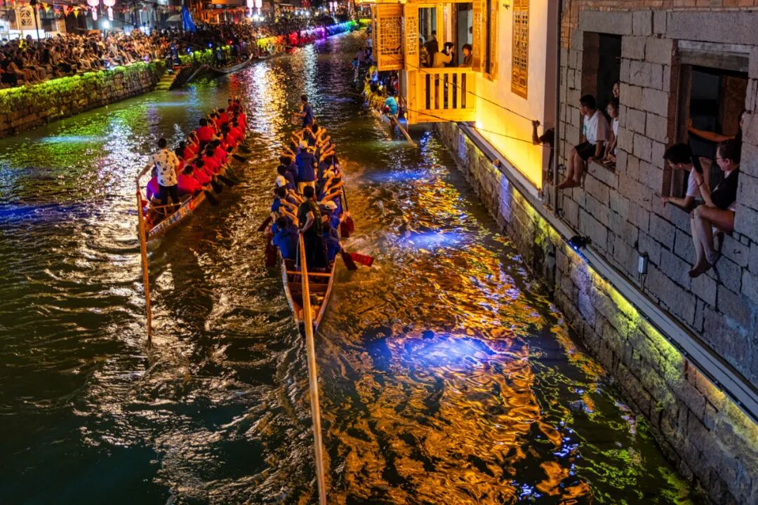 点评:竞技龙舟划过水面,激起层层波光,岸上灯光倒影随波摇曳,斑斓色彩交织,构建出梦幻的视觉氛围,既展现了水的灵动,又凸显了光影的魅力,还从侧面反映出竞技的激烈。两岸围满了兴致勃勃的观众,他们的专注神情与姿态,从侧面烘托出比赛的紧张激烈。