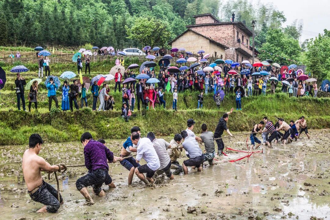 点评:照片层次分明,拔河的对峙双方,身体后仰、双脚蹬地,仿佛能听见他们齐心协力喊出的号子声。山坡上的观众形成了另一道风景,五颜六色的雨伞在翠绿乡景的映衬下格外醒目,他们或呐喊助威,或屏气敛息,生动地烘托出激烈的比赛氛围。