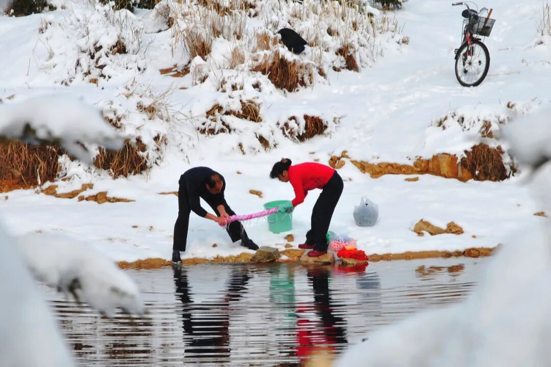 点评:长焦镜头取景,空间被压缩后,画面中心在河边洗衣的两人格外突出,成为焦点。周遭环境被白雪覆盖,纯净洁白场景营造出干净且静谧的氛围,与人物的劳作形成动静结合的美感。照片右上方停放的自行车填补了画面空白,还增添了生活气息与信息量。