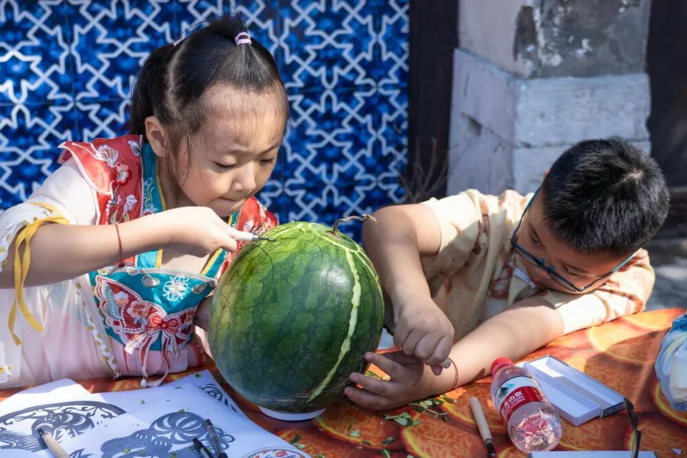 点评:姐弟二人分工合作,沉浸在瓜灯雕刻的乐趣里。左侧的姐姐眼神紧紧锁定手中的瓜灯,雕琢动作细致入微。右侧的弟弟也不甘示弱,脑袋低垂,雕刻瓜灯底部。作者精准捕捉到他们的神态,精准呈现了孩子的天真无邪和一丝不苟。