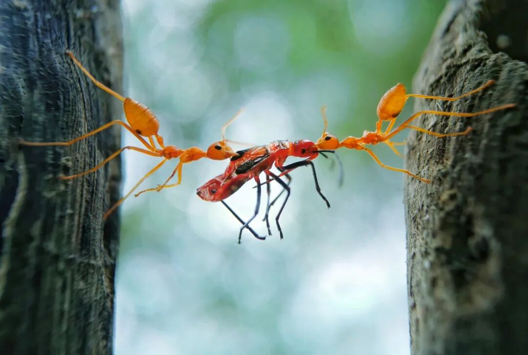 点评:两只黄猄蚁分工明确,在两根树枝上默契协作,紧紧衔着捕获的昆虫奋力攀爬。微距视角下,黄猄蚁肢体关节的纹理以及猎物翅膀的细微结构都纤毫毕现、清晰可辨,生动展现了大自然造物的精妙。