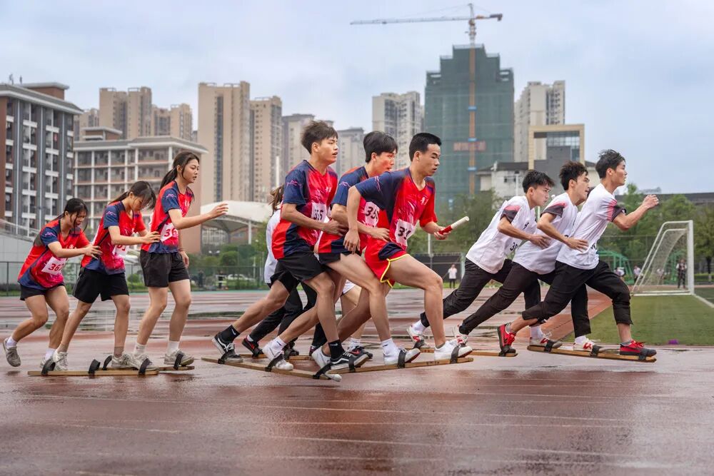 点评:几组队员在雨后的赛场上紧密配合,同踏木板鞋奋力前行,队员们专注坚毅,令人动容。这幅照片巧妙融合环境与人物动态,深刻诠释团队协作力量,让观者仿若置身现场,感受运动的激情与魅力。