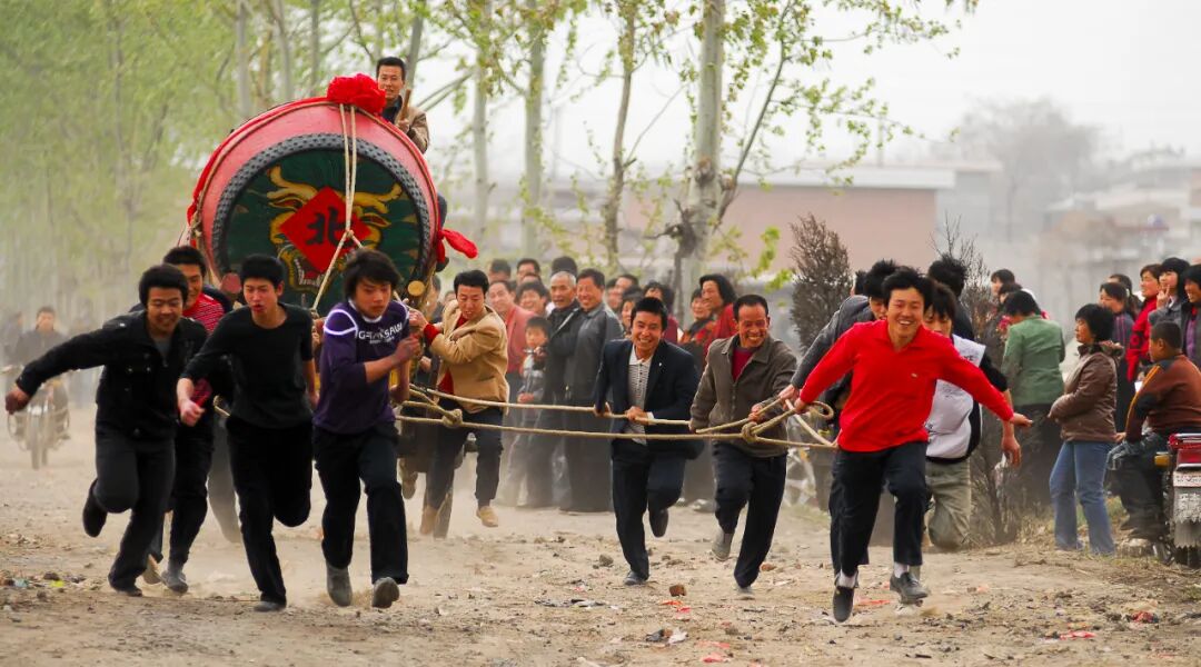 点评:青年们齐心协力拉动鼓车,身姿矫健、步伐有力,动感扑面而来,生动诠释了跑鼓车活动中团结协作的精神内涵。作者将鼓车置于左侧黄金分割线处,既突出主体,又为画面留出充足空间,使观者的目光自然聚焦在活力满满的青年与古朴鼓车上。
