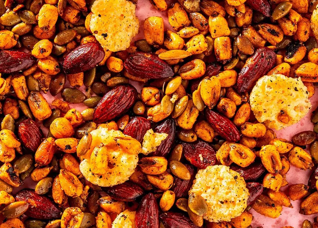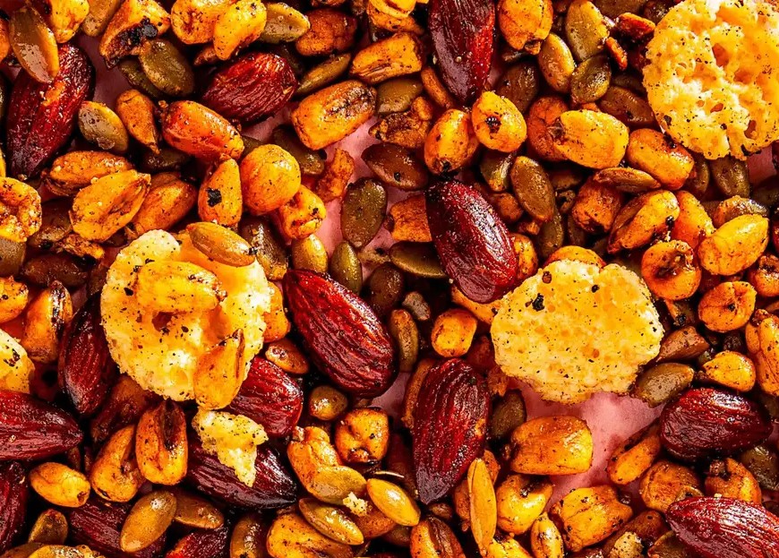 烤盘铺上油纸,烤箱预热到 150℃,把烤架分别调到中层和下层。这边一个烤盘里,两种芝士碎充分拌匀,摊成薄薄一层;另一边,玉米粒、南瓜子、杏仁、辣椒碎、食盐、两种红椒粉、黑胡椒,再加上 120 毫升蒜油,统统倒进另一个烤盘,翻拌均匀后也铺平。接着,芝士盘送进中层,烤 15 分钟,看着芝士慢慢融化、变得金黄酥脆;下层的玉米混合物烤 15 分钟,等杏仁泛起诱人的焦黄色,就可以把两盘美味都端出来晾凉啦。