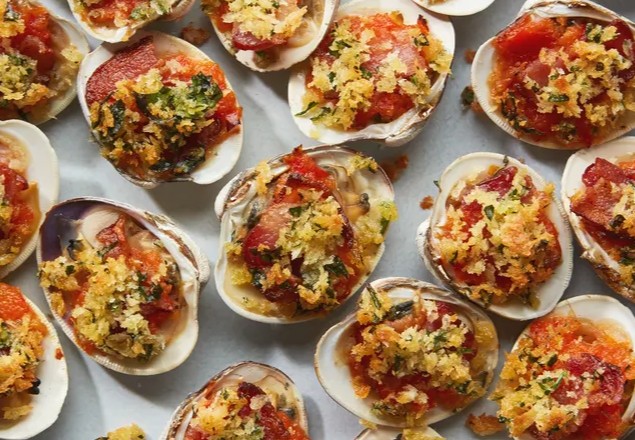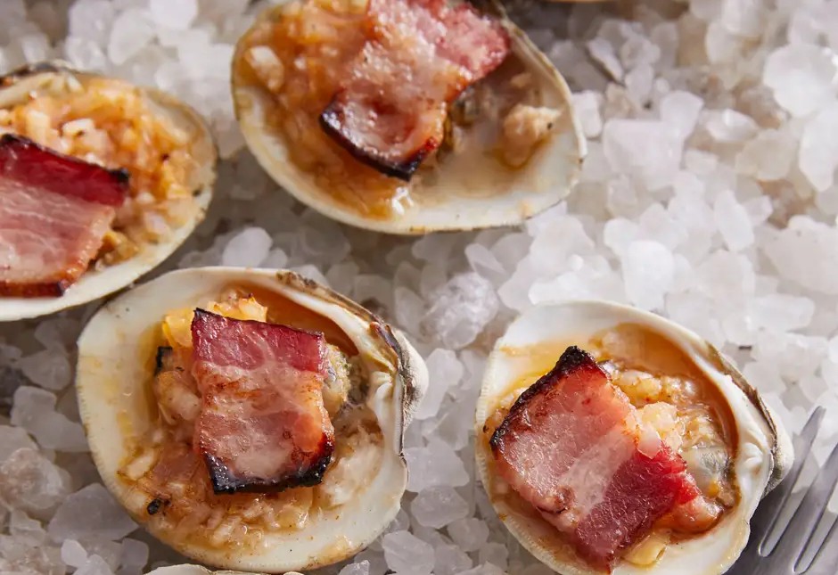 软化的黄油里拌入葱头碎、辣椒粉,撒盐和黑胡椒调出咸鲜底味。每个花蛤上舀满一勺黄油料,再盖块培根粒。送进烤箱烤 5 分钟,直到培根边缘焦脆、黄油泛起金黄泡泡 —— 这时候满屋子都是黄油烤培根的勾人香气!​