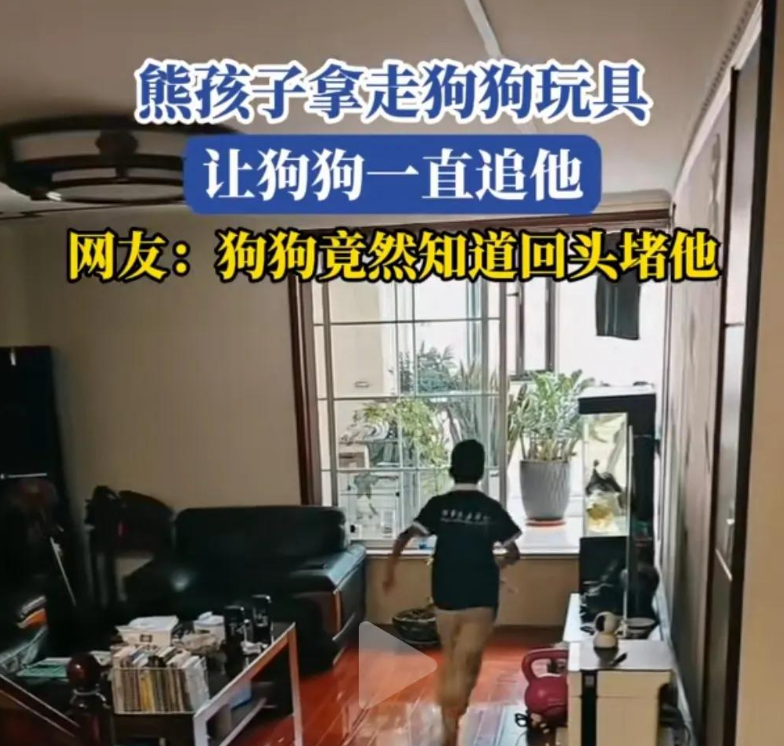 事情是这样的,有个调皮的熊孩子看到狗狗的玩具,一时兴起,趁狗狗不注意,一把抢走撒腿就往屋里跑,估计是想逗逗狗狗。狗狗反应超快,发现宝贝被抢,嗷一嗓子就追了上去。谁能想到,追着追着,狗狗突然在门口急刹车,转头就往另一个门跑去!