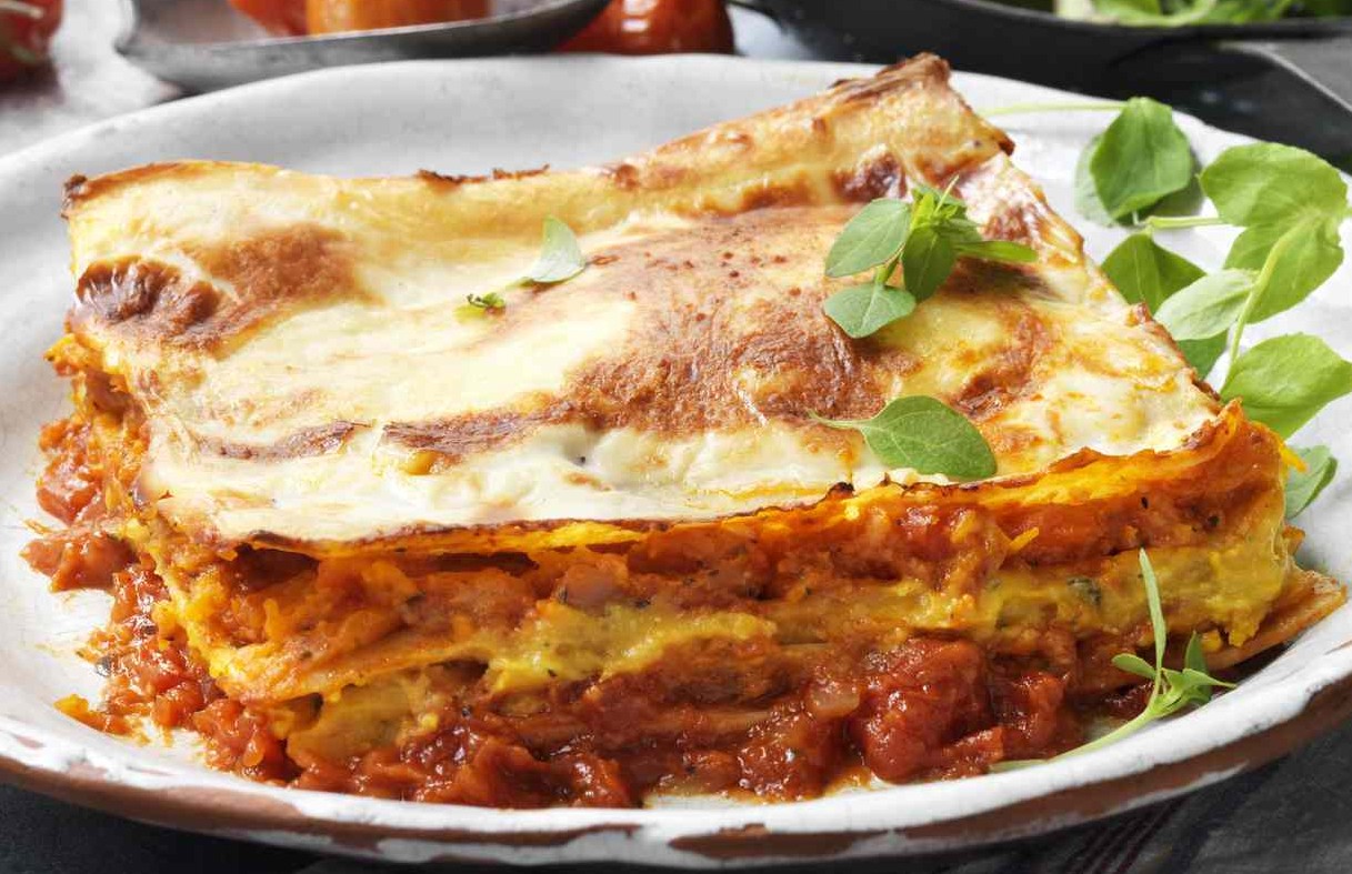 90 克无盐黄油、60 克面粉、800 毫升纯牛奶、食用盐、5 克五香粉、20 克食用油、900 克新鲜牛肉馅、45 克番茄沙司、30 克香菜、10 克孜然粉、3 瓣大蒜,切末、1/4 个洋葱,切丝炒香、3 克黑胡椒粉、800 克新鲜番茄,去皮切碎、450 克干千层面、紫苏叶、450 克切片火腿、340 克拉丝芝士、45 克芝士粉
