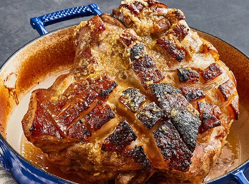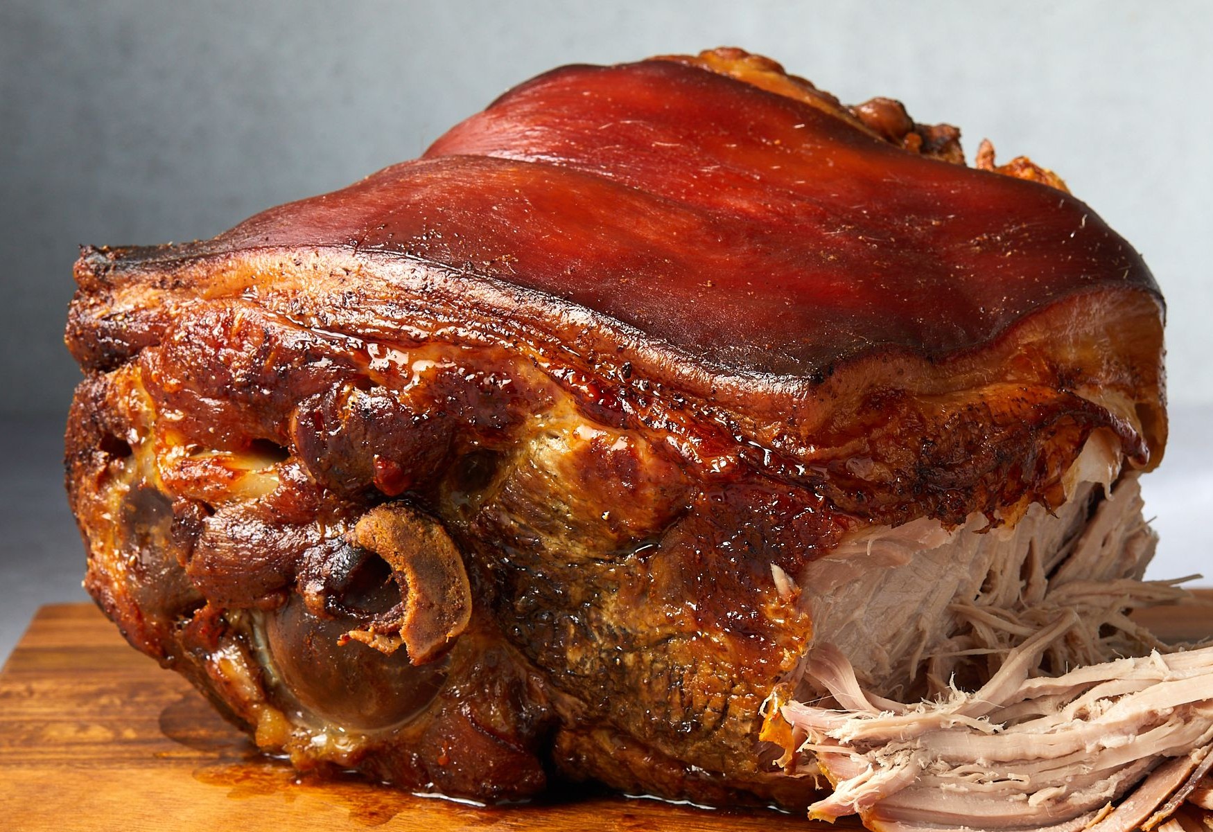 烤之前,先把烤箱预热到 160℃,把烤盘放在中下层,用厨房夹把猪肩肉皮朝上放进铸铁锅,倒入 2 杯温水,在表面再撒点盐和黑胡椒。盖上锅盖或者裹上锡纸,放进烤箱慢烤 4 – 5 小时。这时候揭开盖子,调到 220℃继续烤 5 – 10 分钟,把猪皮烤到金黄酥脆,不过要注意别烤焦了!烤好之后,把肉移到砧板上静置一会儿,锅里的汤汁留着下一步用。