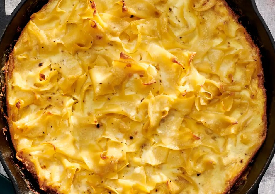 第三步:最后拿出炒锅,开中大火倒入剩下的黄油。等黄油融化冒泡时,下蒜末和洋葱丁,不停翻炒直到洋葱边缘变成浅棕色,厨房瞬间会飘起焦香与蒜香交织的味道,这是提升风味的关键。接着把拌好酱汁的面条倒进锅里,用铲子铺平,直接送进预热好的烤箱烤 35 – 40 分钟。当看到边缘的面条变得金黄酥脆,中间微微鼓起时,就可以端出来了。