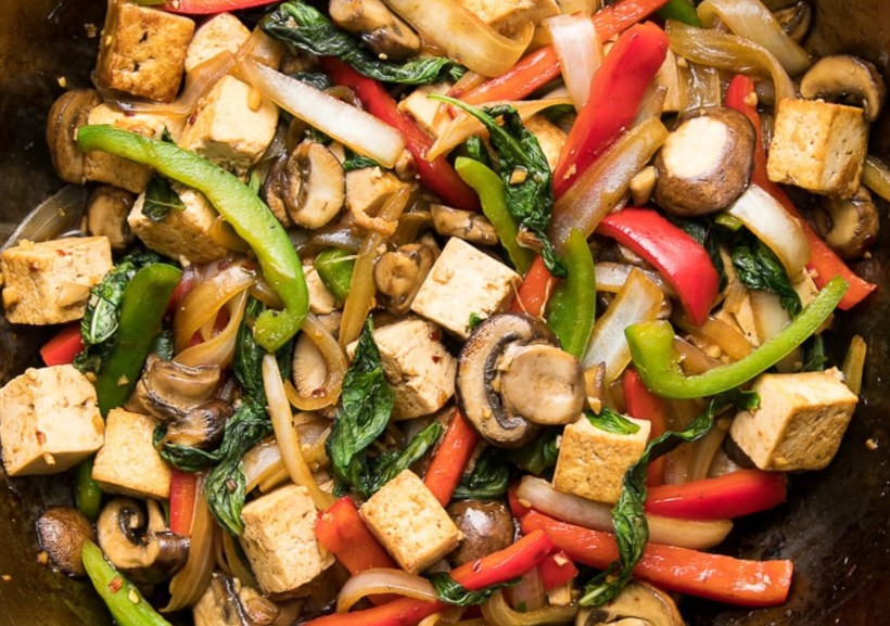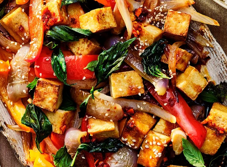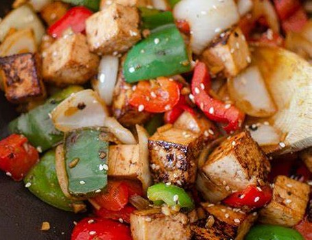 4、转大火把锅烧热,倒入剩下的油,放进彩椒和洋葱快炒 7 分钟,等蔬菜变软边缘微焦时,下姜蓉和蒜片炒出香味,接着放入罗勒叶炒 10 秒至变软,再把煎好的豆腐和酱汁倒进去,翻炒 30 秒让酱汁浓稠地裹住食材。关火后按喜好加勺油泼辣子,撒上白芝麻,配碗白米饭更地道。