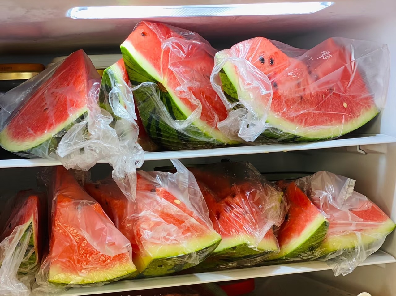 - 暴露存放易招细菌:就算放在冷柜里,西瓜切面暴露在空气中,加上频繁开关柜门,温度波动会让细菌悄悄繁殖。曾有实验检测过,切好的西瓜在室温下放 2 小时,细菌数量能暴增 10 倍!
