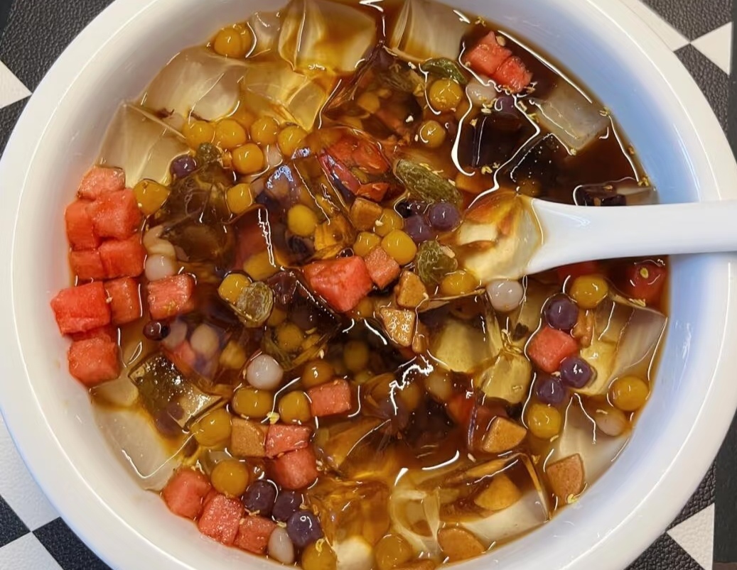 讲究点的店还会加好多料:泡在水里的荔枝肉白得像玉,碎山楂和花生碎撒在上面嚼着咯吱响,最妙的是来勺醪糟,米酒的香味混着冰粉的凉,一口下去浑身都舒服。用勺背一压,冰粉就碎成小块,带着红糖的甜和水果的酸滑进喉咙,瞬间感觉暑气都随着这口凉意在晚风里散了。