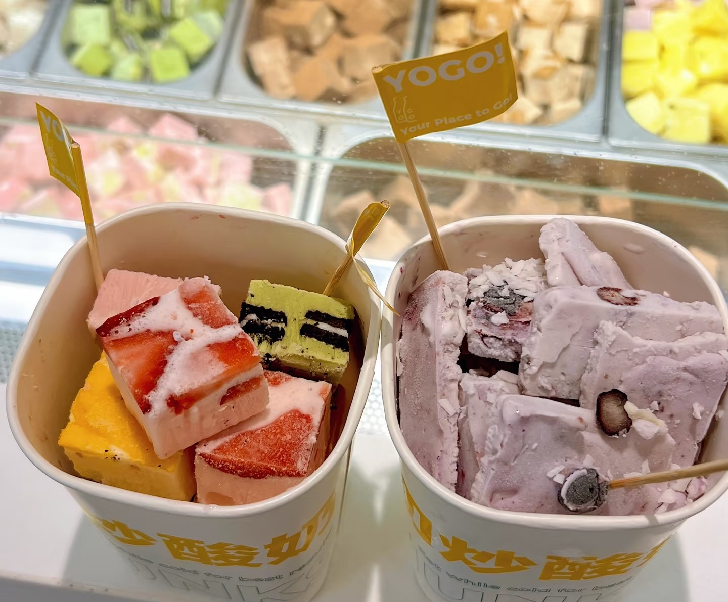 芒果炒酸奶带着热带的热情,金黄的果肉和酸奶拌在一起,撒上脆爽的巴旦木碎,每口都能吃到果肉的纤维和坚果的香脆;蓝莓炒酸奶像把星空揉进了酸奶里,深紫色的果粒在冰碴里若隐若现,嚼到时会爆出酸甜的汁水;最有创意的是奥利奥炒酸奶,饼干碎碾成粉末混进酸奶,冷冻后变成黑白相间的纹路,吃起来既有酸奶的酸甜,又有饼干的酥脆,在舌尖上玩起了冰与火的搭配。用铲子铲起一块,能听到冰碴碎裂的清脆声,入口先是冰凉的刺激,接着是酸奶的醇厚和水果的甜,最后以坚果的香脆收尾,暑热一下子就被这丰富的口感冲散了。