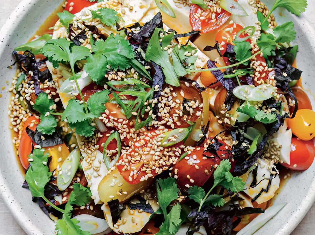 3、摆盘上桌:把腌好的圣女果连汁浇在豆腐上,撒上葱花、香菜、紫苏丝和白芝麻,清爽开胃的夏日限定美味就快要完成啦!