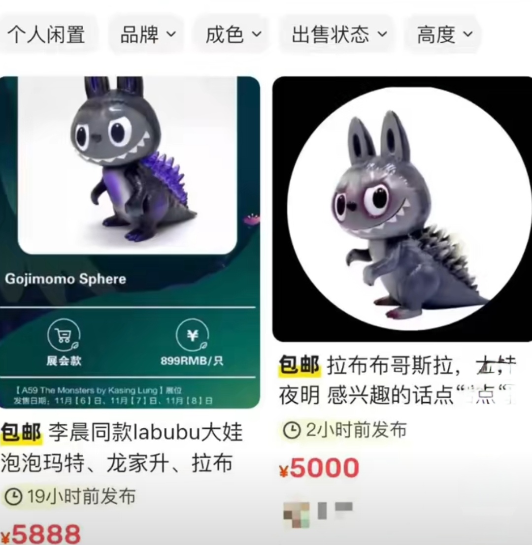 最近,明星李晨在社交平台晒出的一只玩偶火出圈了!2020 年,他花 899 元买下的哥斯拉 Labubu 潮玩,如今在二手平台上,全新未拆封的标价直接飙到 5188 元,相当于短短几年就翻了近 6 倍!这价格涨得,堪比坐上了火箭,让不少人直呼 “早知道我也囤几个”。