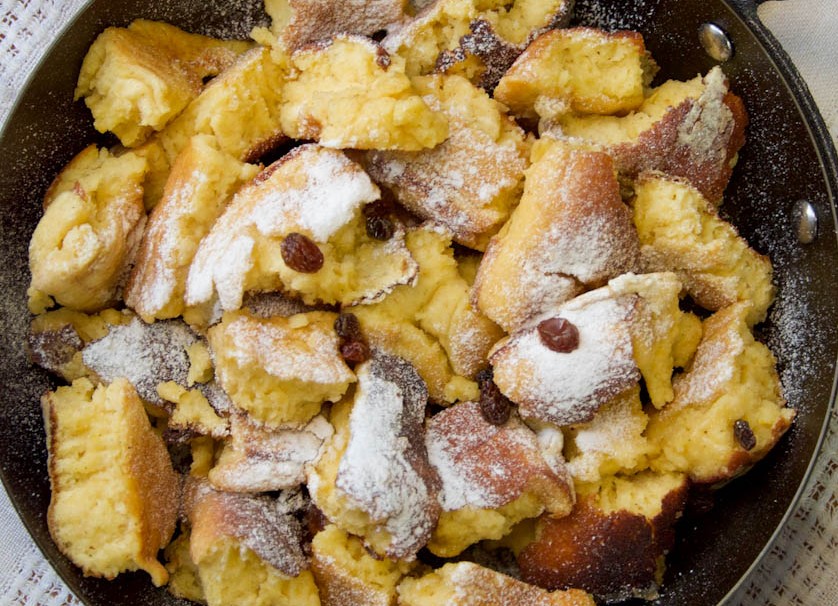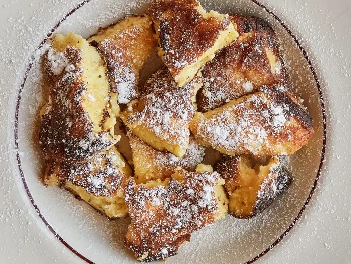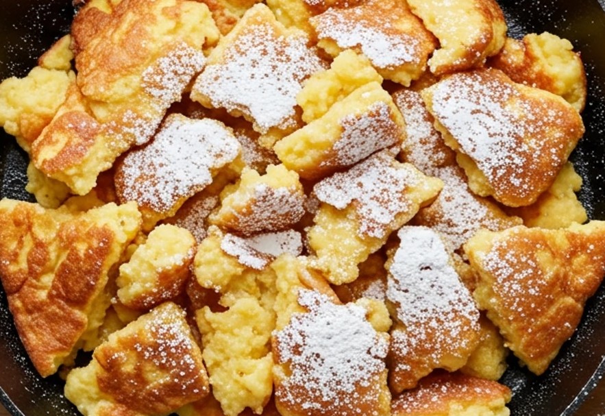 步骤二:在不粘锅里倒入一半的澄清黄油,开小火慢慢加热。等黄油融化后,把面糊一股脑倒进锅里,静静煎上 4 分钟左右,直到煎饼底部变成诱人的金黄色。这时用铲子把煎饼切成四块,小心翻面,再沿着煎饼边缘淋上剩下的澄清黄油,继续煎 4 分钟,把另一面也煎至金黄。最后用铲子把煎饼切成大小不一的小块,盛到盘子里,撒上满满的糖粉。趁热咬上一口,要是觉得不够过瘾,再搭配上喜欢的水果酱,味道简直绝了!