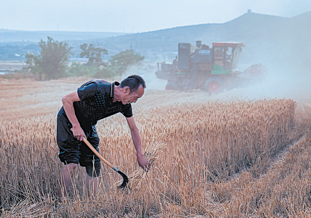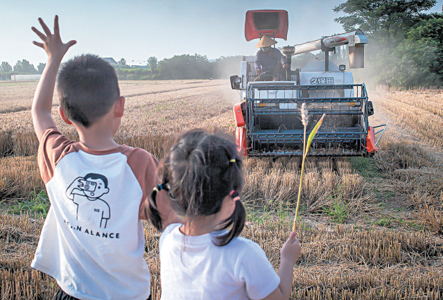 收割机在人面前呼啸而过,想要做好完美的构图再拍摄是非常难的,不可能有充足的时间让你去思考、构图再拍摄,要根据收割机运行的路线和节奏,结合麦田里的光线、人物、背景等快速做出取舍拍摄。首先要做到画面中的主体突出、清晰,其次要留意主体和陪体要有一定的关联,画面中人物作为主体时,收割机、三轮车等作为陪体,配合主体人物来讲清楚画面想表达的内容。