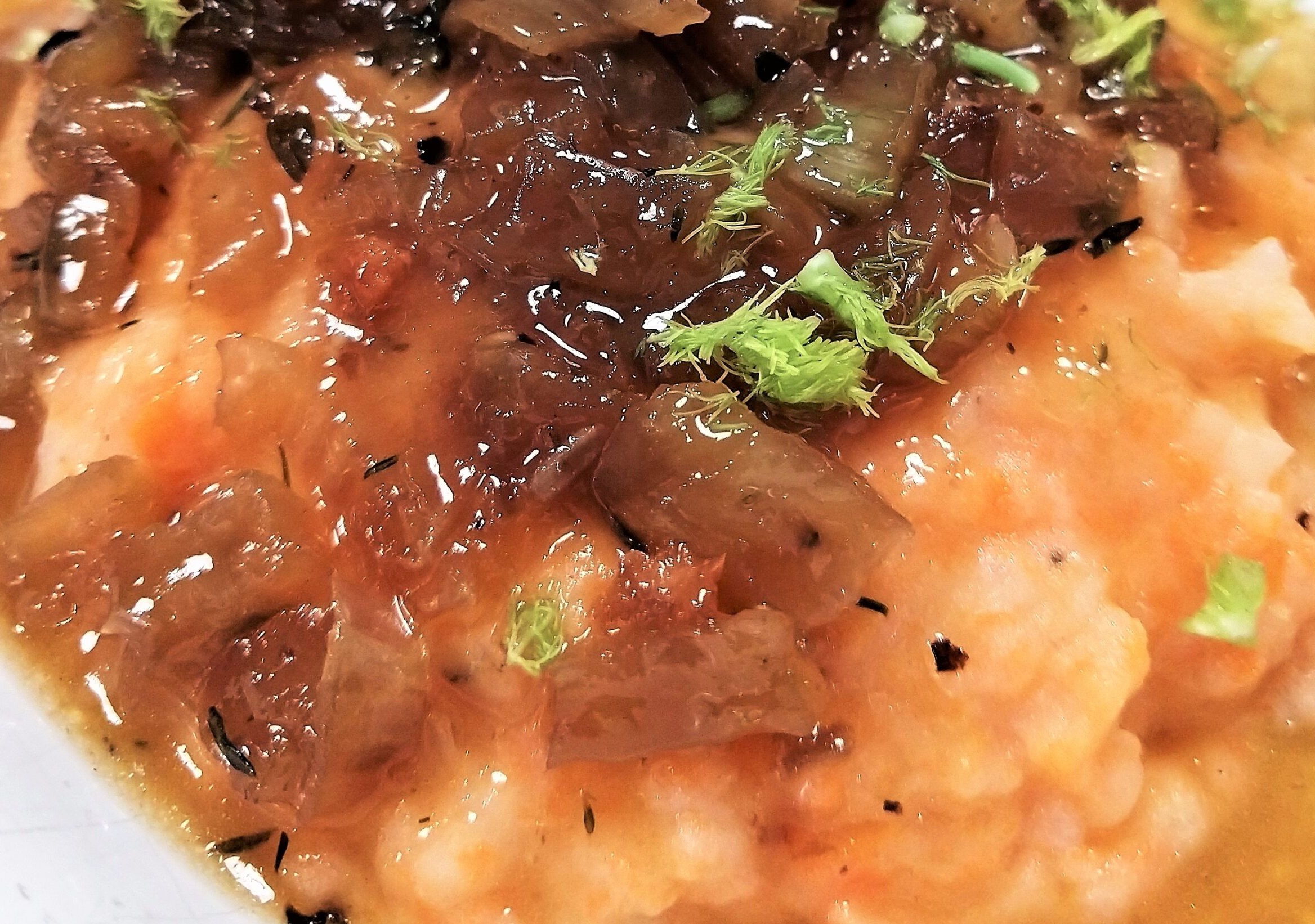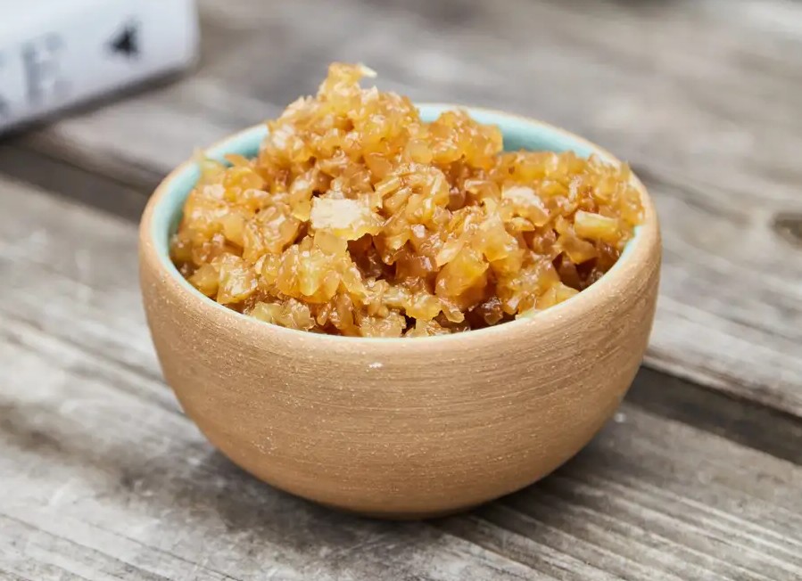 4、等果酱不烫手了,倒在案板上,用大刀细细剁碎。如果觉得手动剁碎太麻烦,也可以用料理机打碎,但注意别打得太碎,保留一些颗粒感,口感会更丰富。最后把做好的茴香果酱装进干净的密封容器,放进冰箱冷藏,能保存 3 周之久。