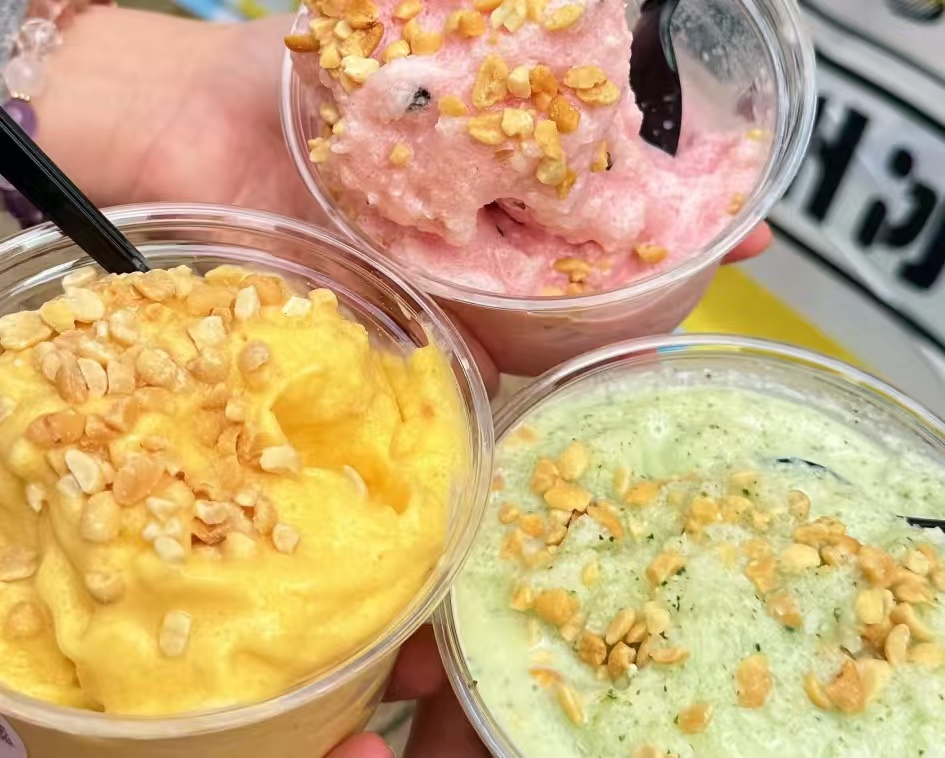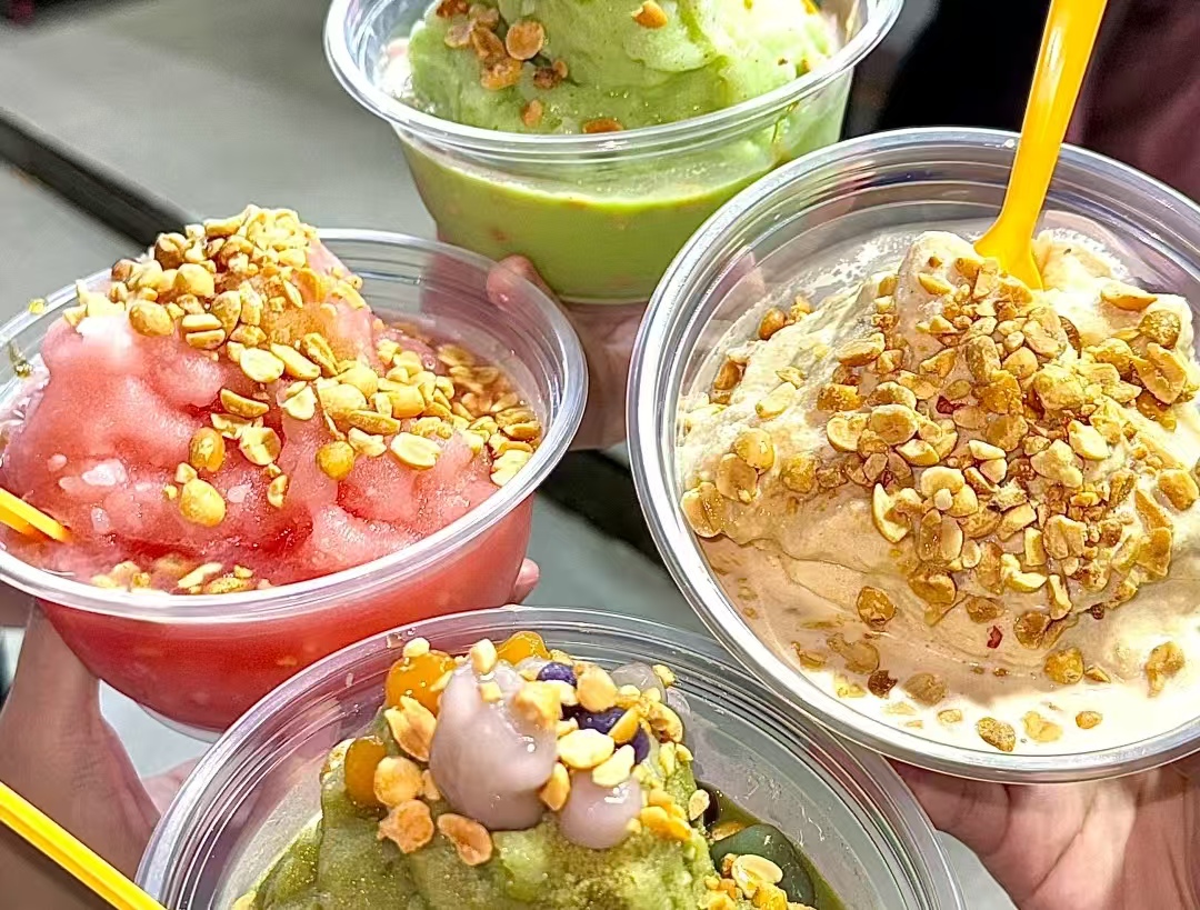 那贵州冰浆为啥能这么火?原因可不少!首先就是口感太绝了!它不像普通冰沙那样粗糙,也不像奶昔那样浓稠,吃起来细腻丝滑,还带着糯米的软糯嚼劲,每一口都果香四溢,甜度也刚刚好。草莓味的酸酸甜甜,荔枝味的清甜多汁,凤梨味的浓郁爽口,再加上山楂、红枣、葡萄干、花生这些小料,口感层次直接拉满!要是淋上红糖,香甜和清爽完美融合,吃一次就忘不了。
