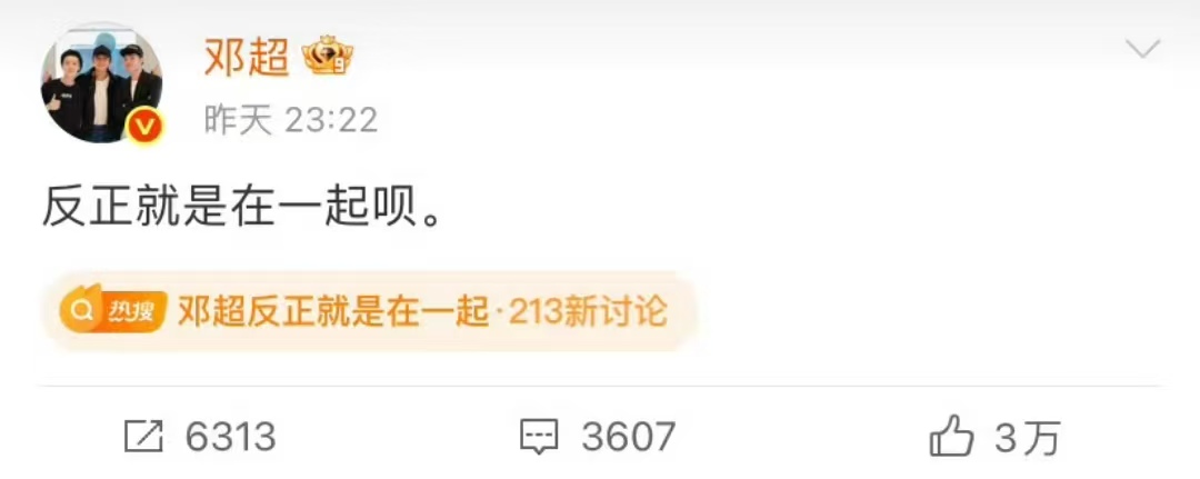 当晚,邓超在微博上的回应更是将热度推向高潮。他简单一句 “反正就是在一起呗”,看似随意,却透着满满的默契与亲密。这条微博一经发出,迅速引发网友热议,“# 邓超回应和鹿晗吃饭 #” 的话题强势登上微博热搜第一,成为全网焦点。不少网友调侃:“超哥这回应,主打一个随性,兄弟相聚就是这么简单直接!”
