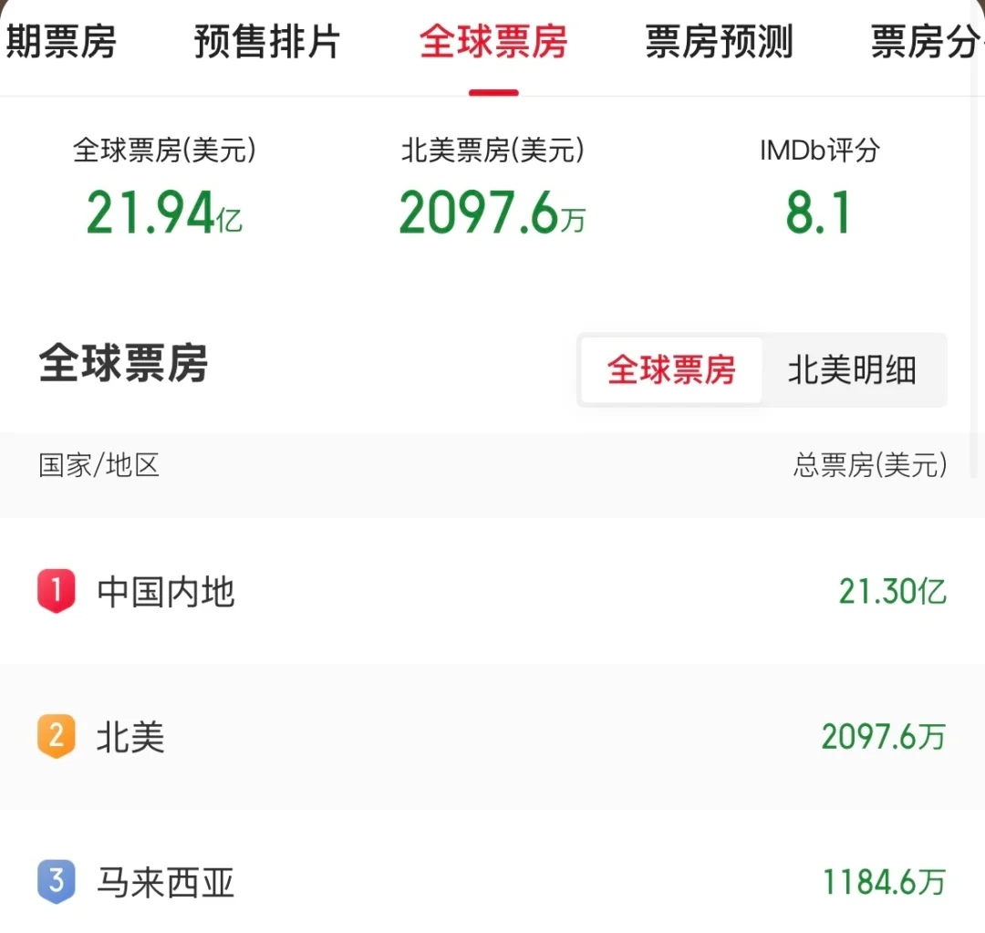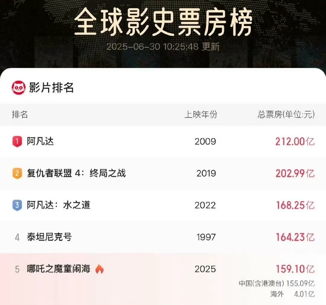 灯塔专业版数据显示,截至下映当日,《哪吒 2》累计票房达 159.09 亿元,稳居全球影史票房榜第五,成为首部跻身该榜单前五的亚洲电影。影片上映首月票房便突破 48.4 亿元,随后在五一档上演 “逆跌” 奇迹:以 6.3% 的排片占比贡献 10.2% 的票房,单日最高票房达 1.2 亿元。在国际市场,《哪吒 2》同样成绩斐然,北美首周单馆收益 720 万美元,位列同期第二;在澳大利亚收获 235 万澳元票房,创华语影片新纪录;东南亚地区预售量占当地同期市场的 35%。