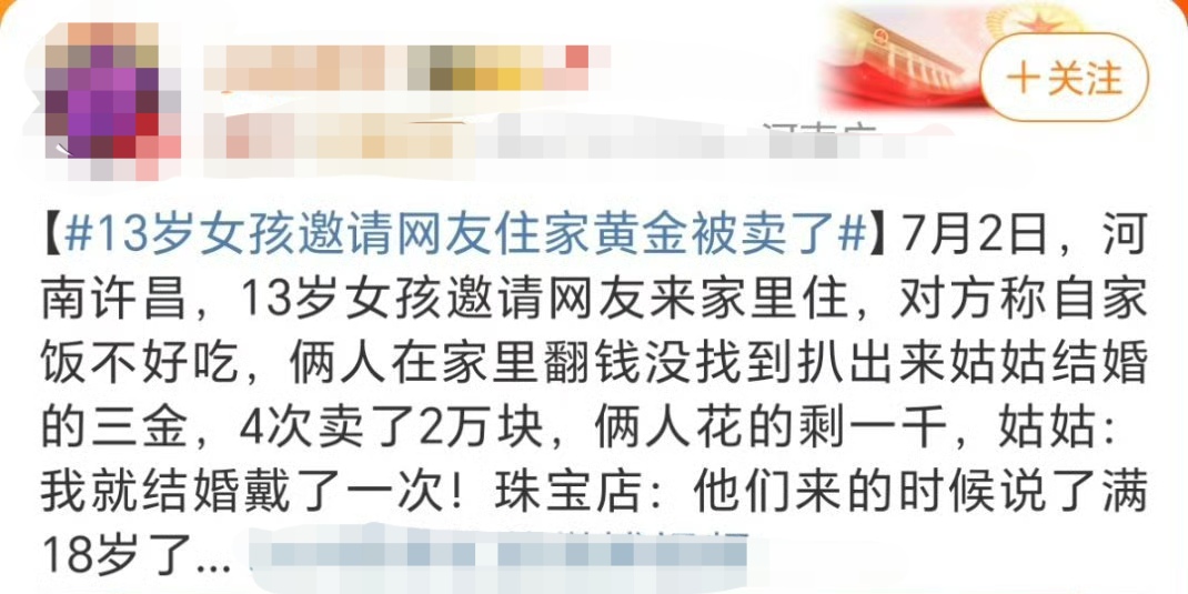 “就戴过一次的结婚首饰,全没了!”7 月 2 日,河南许昌的李女士遭遇糟心事 —— 侄女邀请网友来家住,结果两人把她的三金全卖了,2 万块钱挥霍得只剩 1000 元。这事一经曝光,不少家长直呼 “太吓人”,也给所有人敲响了警钟。