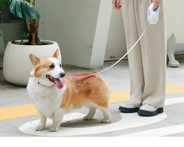 就是一个塑料手柄,里面卷着细绳或扁带,靠弹簧和按钮控制。解锁时绳子能自由拉长缩短,锁住后长度就固定了,末端有个卡扣,能扣在狗项圈或背带上。