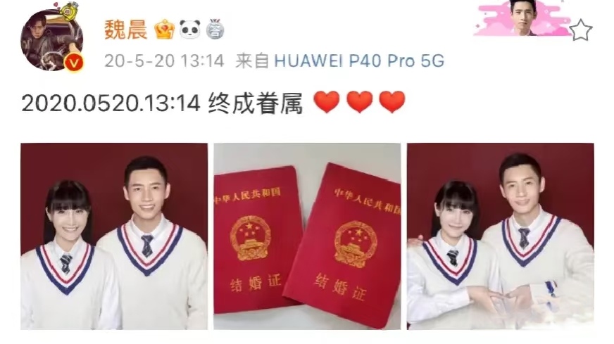 魏晨和他媳妇于玮的爱情,还得从四川音乐学院的校园说起。他俩是大学同学,在学校那会儿就认识了,慢慢走到一块儿,这么多年一直互相陪伴,感情特别好、特别稳。2020 年 5 月 20 日那天,魏晨特意卡点 13:14 在微博上晒出结婚证,跟大家说自己和于玮结婚了,这 “5201314(我爱你一生一世)” 的寓意,真是甜到心坎里了,也开启了他们人生的新阶段。到了 2021 年 12 月 22 日,两人在风景超美的三亚办了场盛大的婚礼,婚后还有了个可爱的儿子,小日子过得别提多幸福了。