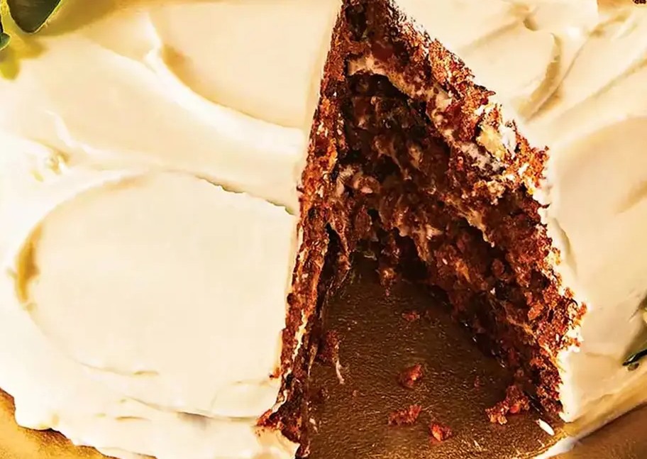 6、最后组装蛋糕:取一片蛋糕,表面铺上一半的糖霜,再盖上另一片,剩下的糖霜均匀抹在顶部和侧面(只抹顶部也可以哦)。切成小块,室温吃就很美味。剩下的蛋糕密封好放冰箱,能存 3 天呢。​