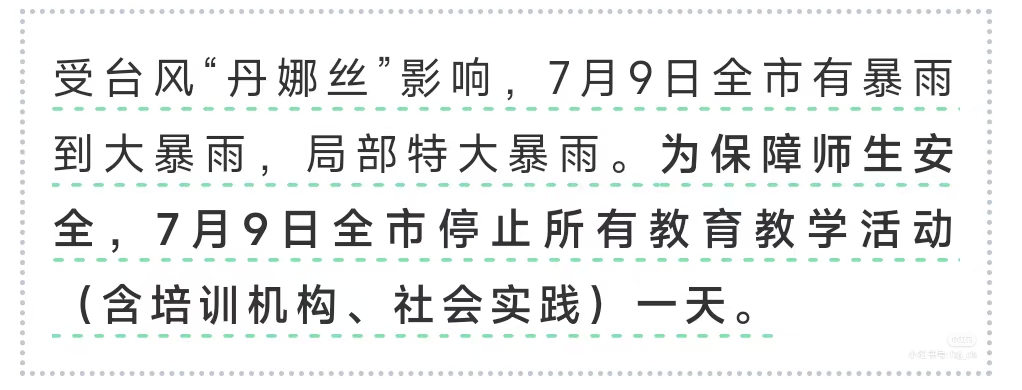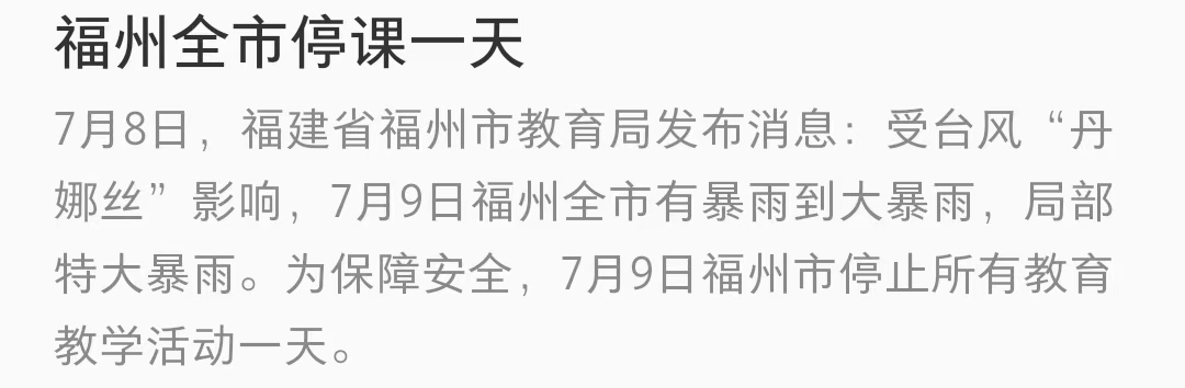 7 月 8 日,福州市教育局紧急发布通知:受台风 “丹娜丝” 影响,7 月 9 日全市将遭遇暴雨到大暴雨,局部可能出现特大暴雨。为保障师生安全,当日全市所有教育教学活动(含培训机构课程、社会实践等)全面暂停。