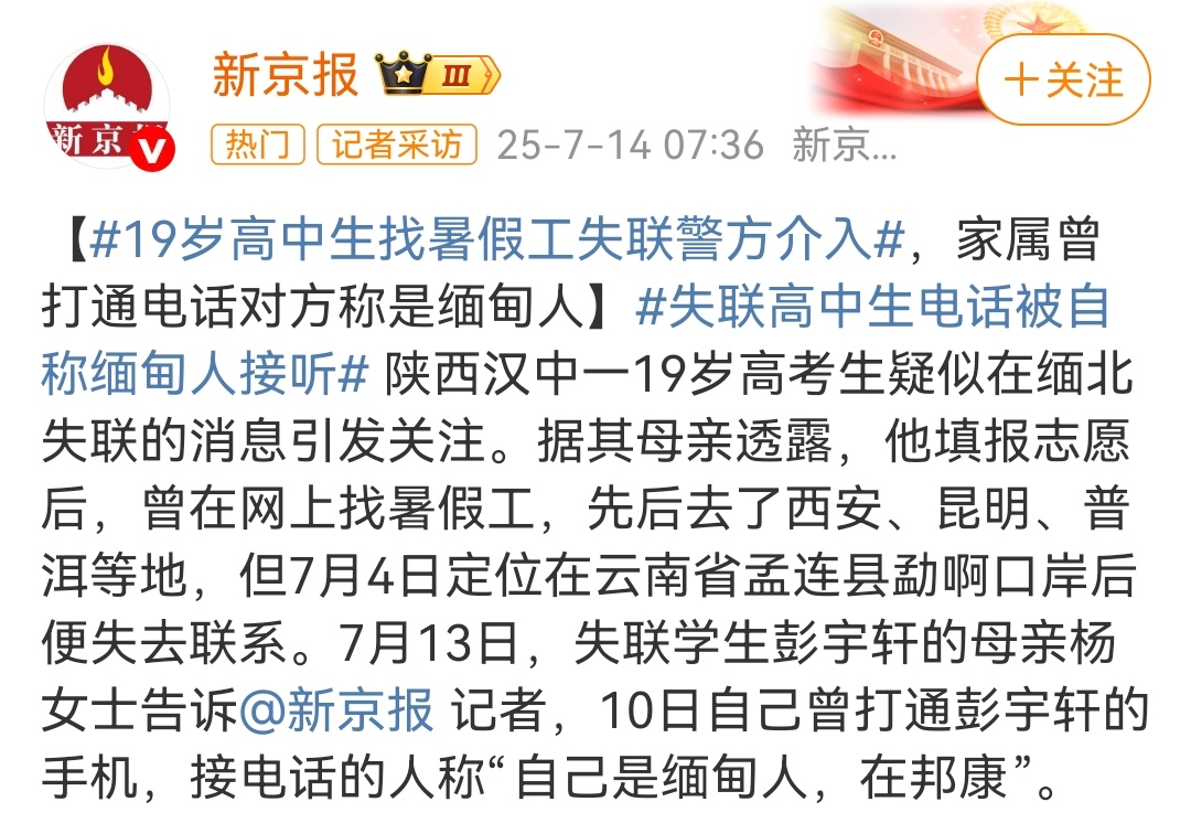 7 月 12 日,陕西汉中的杨女士向媒体反映,其 19 岁的儿子彭宇轩作为一名高考复读生,已失联逾一周。6 月底,孩子称要前往西安打暑假工,然而杨女士后来才得知,儿子竟已身处缅甸。