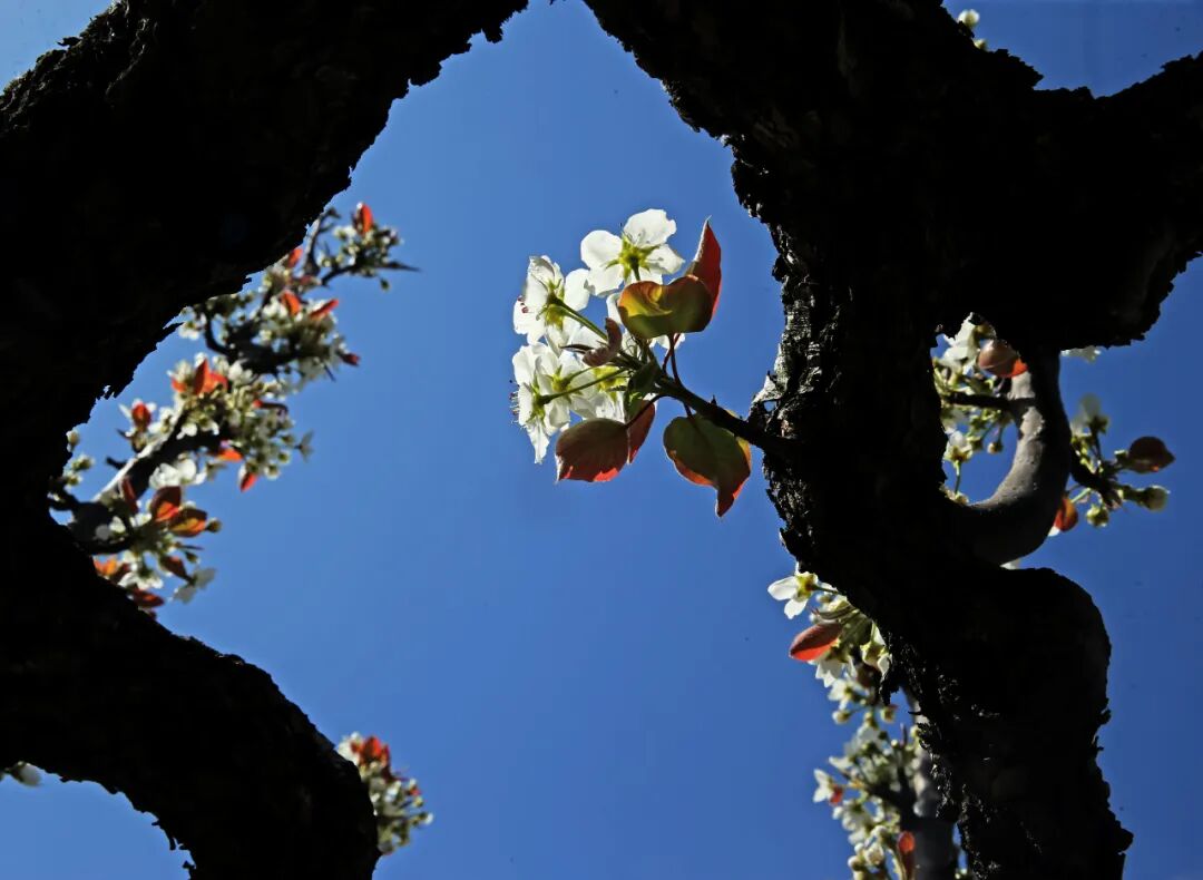 点评:这幅照片以大范围的蓝天构建呼吸空间,虬曲枝干形成天然画框。白花红叶点缀其间,深色枝干与亮色花朵对比强化,画面整体简约大气。