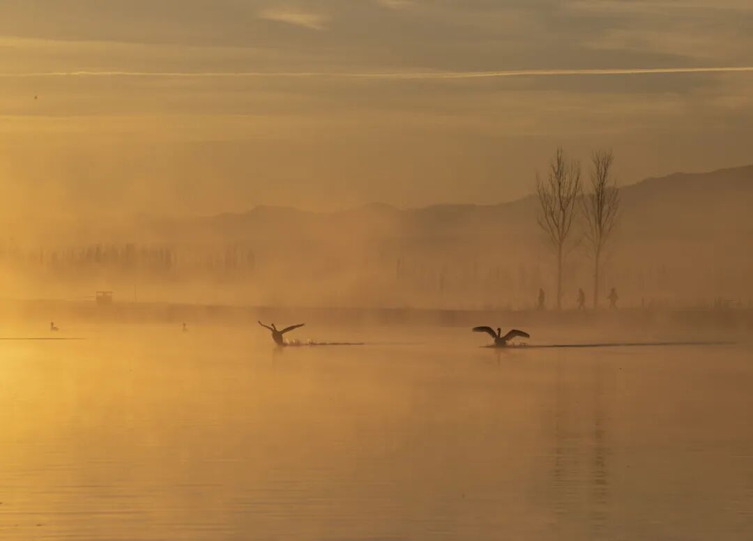 点评:这张照片以湖面雾气、朦胧远山与霞光作为天然背景,飞鸟展翅方向预留呼吸空间,黄金时刻的暖调渲染静谧氛围,虚实对比间既突出主体动势,又赋予画面诗意。