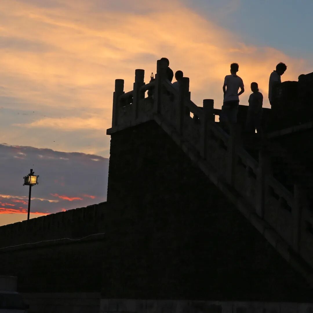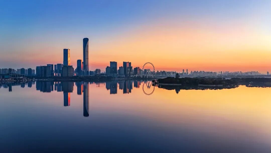 点评:这幅照片以湖面倒影构建双重留白,摩天轮与城市在镜面对称中互为映衬。渐变天空从橙黄到湛蓝,塑造视觉纵深效果,营造出夜色降临的静谧诗意。