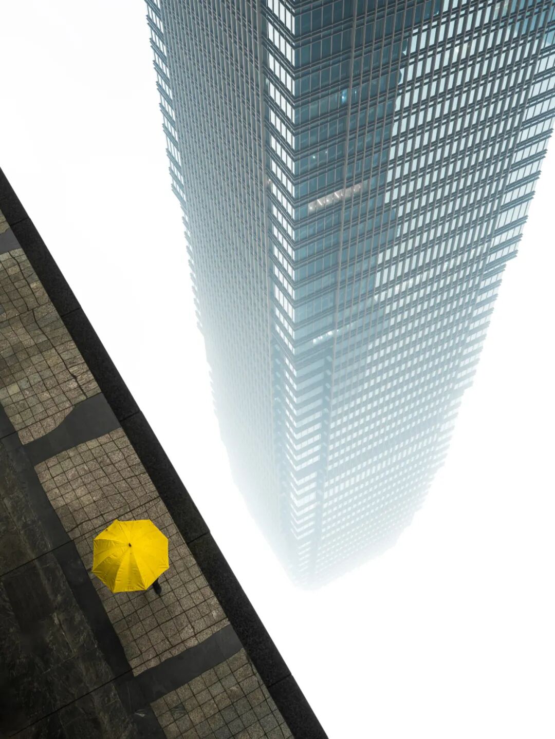 点评:画面主体是左下角撑黄雨伞的人物,背景是高耸的摩天大楼,黄雨伞在灰白背景中得到突出,而雾气和朦胧的建筑进一步营造出孤独、压抑的氛围。