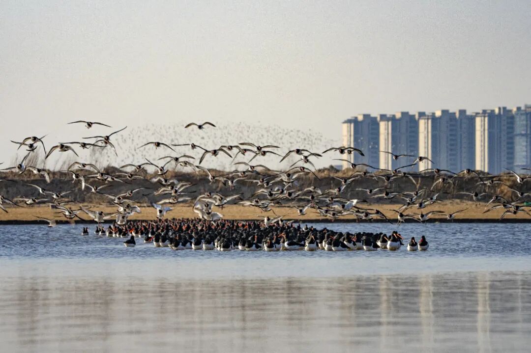 点评:这幅照片以水面和天空留白平衡密集鸟群与城市楼群,飞鸟的动与建筑的静形成对照,城市与自然的融合在虚实间展现。