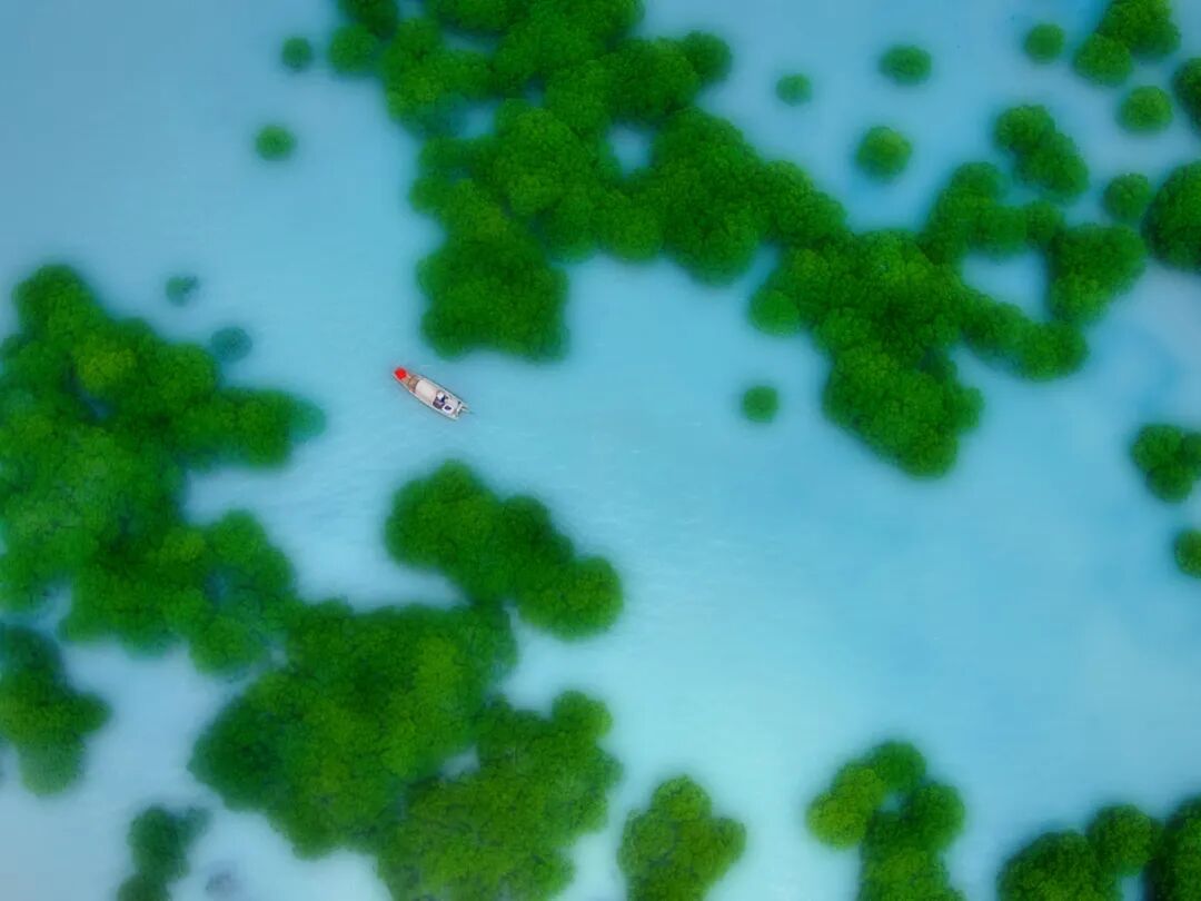 点评:这幅航拍照片巧妙运用大面积水域留白,让白船成为视觉焦点。蓝绿色植被布局疏密有致,通过船尾波纹暗示动态延伸,生动诠释了“少即是多”的哲理。