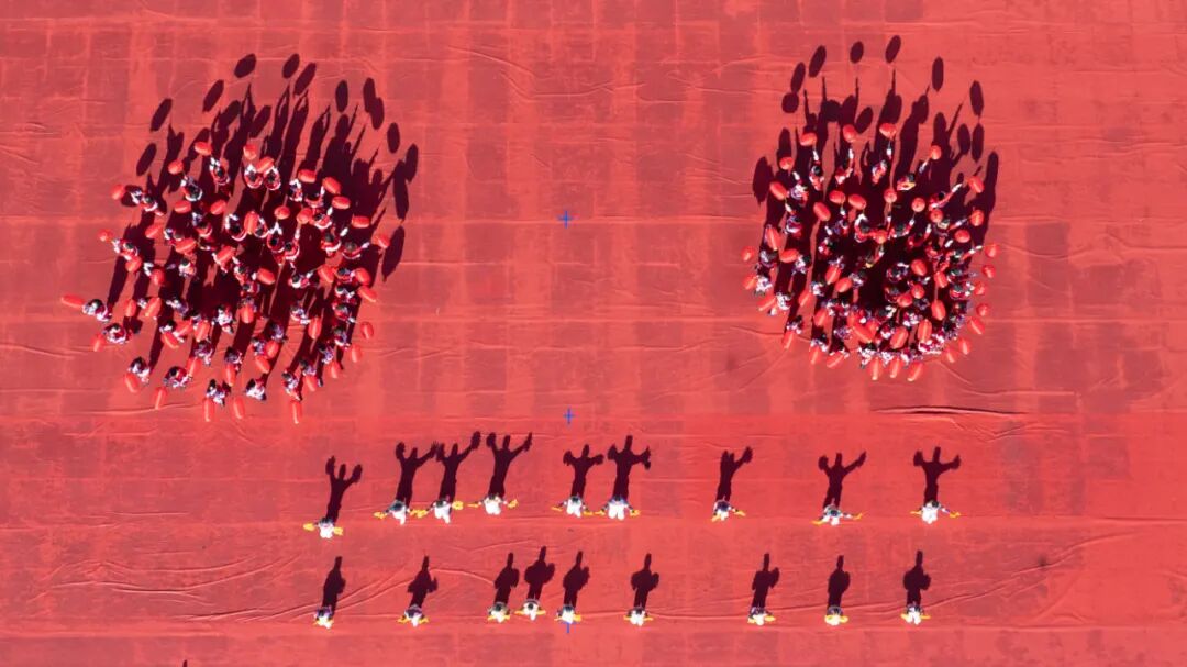 点评:此图以大面积红色操场为背景,人群呈几何形分布,形成视觉“呼吸感”。无人机俯拍视角独特,整体构图颇具张力。