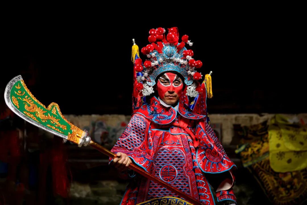 点评:这张照片运用深色背景突出主体,给画面留出了“呼吸”空间,通过强光聚焦人物,凸显戏曲服饰的鲜艳色彩与精致纹样。人物姿态庄重,道具、盔头细节清晰,光影塑造出立体感。