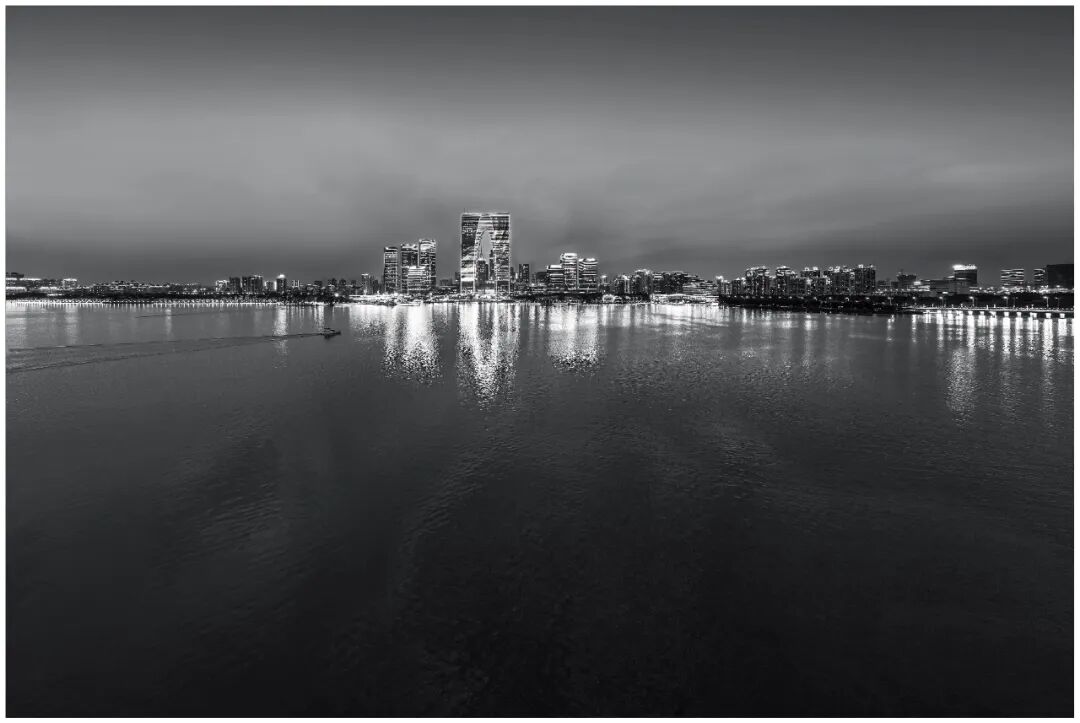 点评:城市建筑分布在上半部分,灯光点点,与水面倒影呼应。黑白灰色调的呈现,令画面具有一定的神秘感,但因前景部分曝光不足,整体氛围稍显压抑。