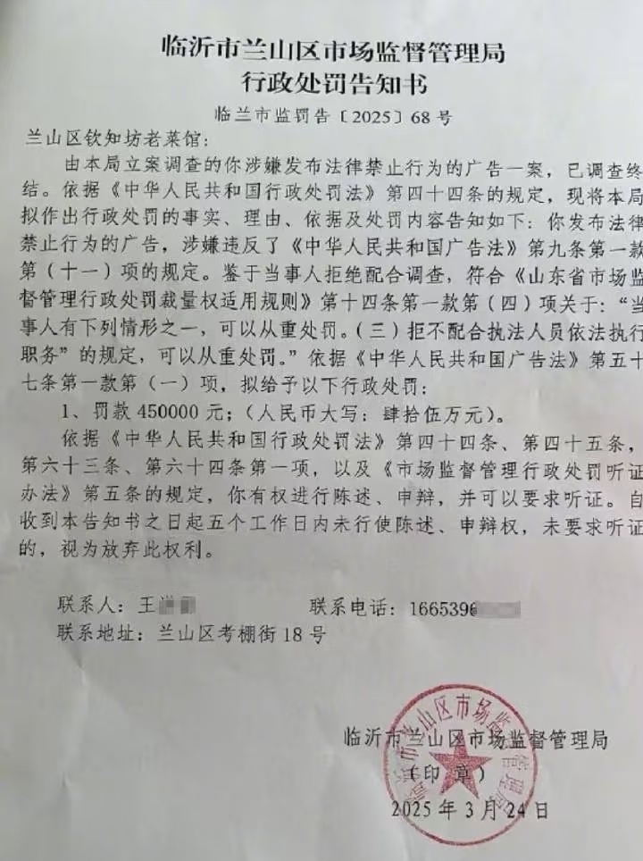 事情还得从今年 2 月说起。张女士在短视频平台上发了段自家餐馆的视频,里面是道叫 “蛤蟆汤” 的菜。她就是想给自家生意打打广告,没想到 3 月下旬就接到了市场监管部门的电话,说这视频涉嫌违法,得配合调查。当时张女士在外地,电话里答应一周内回去处理,还赶紧删了视频。可才过两天,一份 “拟罚款 45 万” 的通知书就塞在了饭店门缝里,上面还写着 “当事人拒绝配合调查”。